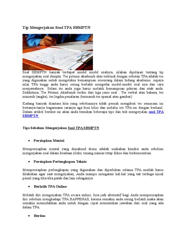Simak Contoh Soal TPA Verbal SBMPTN dan Pembahasannya Agar ... (Inez Mann) Dapatkan kisi-kisi, prediksi, materi yang sering keluar pada SBMPTN. Selain latihan soal, kalian juga akan diberi catatan atau rangkuman materi serta video dari tutor handal. Semoga contoh soal dan jawabannya berikut ini mampu memberikan gambaran tentang pola soal dari ujian TPA SBMPTN.